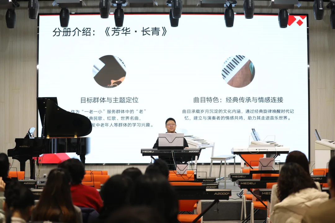 现代出版社编辑、中国音协电子键盘学会李木子老师介绍了即将出版的《经典永流传——电子琴金曲100首》,曲集分《芳华·长青》与《花季·青春》两册,由中国音协电子键盘学会理事李晓丹编著,曲集里的乐曲均由美得理A2000s编配。随后李晓丹老师用美得理A2000s电子琴演奏并讲解了其中的《中国功夫》《舒克和贝塔》《爱江山更爱美人》3首乐曲,分享了编配经验、音色与节奏搭配,民族乐器音色的触键处理。运用电子键盘丰富的音色、节奏、多种伴奏风格及特色功能,精彩演奏出不同风格的乐曲。